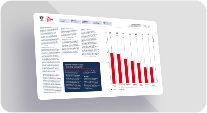 1. Innovative 2. Reach of 3. Regulatory 4. Access to 5. Resilient business Our global offer to business: ecosystem 昀椀nancial activity environment talent and skills infrastructure London and the UK’s competitive 4 strengths supporting economic growth equities returned to their pre-COVID domestic market. Balancing To ensure London remains valuations and deal-making reduced domestic consumer protection with competitive in the next decade, 100 M o signi昀椀cantly. All the GFCs in our wholesale global 昀椀nance players the City of London Corporation has 59 57 48 44 40 31 31 s t c analysis saw a reduction in their does not allow for a one-size-昀椀ts- launched Vision for Economic Growth (-1) (-3) (-3) (-2) (-3) (-6) (-4) o mp ‘reach of 昀椀nancial activity’ score all regulatory regime, something (V4EG), a roadmap that outlines e as capital market trading volumes UK regulators must address to recommendations to drive growth ti ti retreated with rising interest rates. improve competitiveness. and improve outcomes for the FS v e London’s score fell due to a decrease industry. This report references the London’s recovery from the pandemic in investment fund AUM and capital ‘big moves’ recommended in the 80 has also contributed to a healthier markets activity, although foreign V4EG report and links them to the FPS ecosystem. London o昀케ces have exchange volumes increased. Net data that will demonstrate progress. undergone inspired renovations to FS exports remained consistent and The change in economic cycle, create spaces that encourage workers FDI increased. competition for global talent and cost back into the o昀케ce. This can be seen of living crisis are all real obstacles London gained in the ‘talent and in London’s low o昀케ce vacancy rates, facing the FPS industry, in the UK and skills’ dimension as new immigration full restaurants, and busy transport abroad. By taking regular stock of legislation came into e昀昀ect which networks. The City of London’s the UK’s position, through the lens of 60 improved the UK’s attractiveness and cultural o昀昀ering is also a magnet objective data and analysis, we will be accessibility to international talent. for visitors. in a position to meet these head-on The UK and US share the title for and thrive on the global stage. most expensive work visa, however, UK skilled worker visas are more accessible and are processed more swiftly. The UK has the second best 40 pension system amongst GFCs and 10th best in the world, in terms of Vision for Economic Growth bene昀椀ts, regulations and adapting to demographic change. This is a - a roadmap to prosperity: positive for UK and international workers and contributes to a better The City of London Corporation competitiveness. The Big Moves quality of life for citizens. (CoLC) launched Vision for are referenced throughout 20 Economic Growth (V4EG) in this report. London also improved its score in September 2023. This ongoing the ’enabling legal and regulatory L environment’ dimension. The UK work presents a roadmap to Big move: ea s t regulatory regime is highly regarded reinforce the UK’s international Develop a UK FPS strategy and c o around the world and ranks second competitiveness for years to FPS Partnership Council to mp in our analysis. Singapore ranks in come. V4EG convenes a steering support it. The impact of this by e ti 昀椀rst place due to its proactive and board of leading FPS 昀椀gures 2030 will be that Government’s ti v market-aware regulatory approach. and engaged with more than 0 e clearly de昀椀ned strategy for UK- 300 companies across London Although the UK and Singapore based FPS maximises the sector’s London New York City Singapore Frankfurt Paris Hong Kong Tokyo to de昀椀ne a series of ‘big moves’ 昀椀nancial industries share similarities contribution to UK jobs and (UK) (US) (Germany) (France) (Japan) to drive growth and improve –both are international 昀椀nance hubs economic growth. – the UK is a far larger global market 2024 score 2023 score and also has a large sophisticated