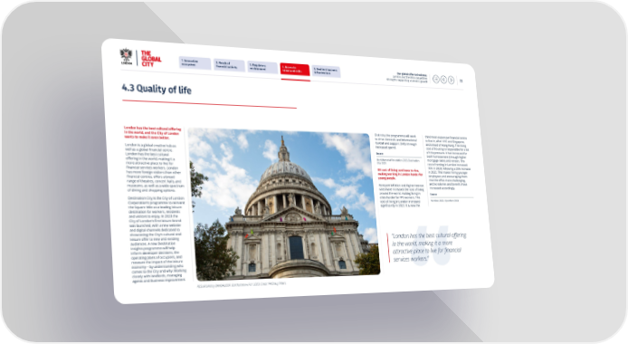 1. Innovative 2. Reach of 3. Regulatory 4. Access to 5. Resilient business Our global offer to business: ecosystem 昀椀nancial activity environment talent and skills infrastructure London and the UK’s competitive 22 strengths supporting economic growth 4.3 Quality of life Districts, the programme will work third most expensive 昀椀nancial centre London has the best cultural offering to drive domestic and international to live in, after NYC and Singapore, in the world, and the City of London footfall and support SMEs through and ahead of Hong Kong. The rising wants to make it even better. increased spend. cost of housing is responsible for a lot London is a global creative hub as Source of this pressure. It has increased for well as a global 昀椀nancial centre. both homeowners (through higher London has the best cultural mortgage rates) and renters. The Mori Memorial Foundation 2023, Destination City 2023 o昀昀ering in the world, making it a cost of renting in London increased more attractive place to live for 10% in 2023, following a 20% increase UK cost of living continues to rise, 昀椀nancial services workers. London in 2022. This makes hiring younger making working in London harder for has more foreign visitors than other employees and encouraging them young people. 昀椀nancial centres, o昀昀ers a broad into the o昀케ce more challenging, range of theatres, concert halls, and and so salaries and bene昀椀ts have Rampant in昀氀ation and higher interest museums, as well as a wide spectrum increased accordingly. rates have increased the cost of living of dining and shopping options. around the world, making living in Source cities harder for FPS workers. The Destination City is the City of London Numbeo 2023, OpenRent 2023 cost of living in London increased Corporation’s programme to reinvent signi昀椀cantly in 2022. It is now the the Square Mile as a leading leisure destination for workers, residents and visitors to enjoy. In 2023 the City of London’s 昀椀rst leisure brand was launched, with a new website and digital channels dedicated to showcasing the City’s cultural and leisure o昀昀er to new and existing “London has the best cultural o昀昀ering audiences. A new Destination Insights programme will help in the world, making it a more inform developer decisions, the operating plans of occupiers, and attractive place to live for 昀椀nancial measure the impact of the leisure economy – by understanding who services workers.” comes to the City and why. Working closely with landlords, managing agents and Business Improvement RESURGAM by BANDALOOP. Bartholomew Fair 2023. Credit PA/Doug Peters.