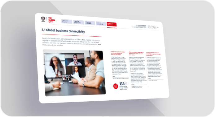 1. Innovative 2. Reach of 3. Regulatory 4. Access to 5. Resilient business Our global offer to business: ecosystem 昀椀nancial activity environment talent and skills infrastructure London and the UK’s competitive 24 strengths supporting economic growth 5.1 Global business connectivity Despite the development and widespread use of video calling, meeting and working together in person is still a fundamental component of business life. International, domestic and intra-city transport networks are essential in ensuring people can work, meet, network and socialise. London airports have the highest Ef昀椀cient commuting has become an London’s construction boom has capacity and are a hub for important factor in the ‘return to caused higher congestion in its tight international transfers. work’ debate. street network. Air passenger numbers remain High quality infrastructure improves London was the most congested city below 2019 across all GFCs except productivity and quality of life. in the world in 2022 as construction for Tokyo which has seen a 20% Singapore is a leader in infrastructure and redevelopment caused road increase. Passenger numbers in quality, however, it is smaller and closures and lane restrictions. London, NYC, Paris and Frankfurt therefore needs less long-distance London drivers spend an average decreased between 10%-20%, but infrastructure than other GFCs. of 13.5 days in rush hour tra昀케c Singapore passenger numbers are People’s perception of their country’s each year, 5.8 days longer than the still down 50% compared to 2019. infrastructure worsened across all of optimum journey time. The average London saw the highest number of the GFC countries in 2022 except the morning and evening rush hour air passengers in 2022, increasing US which improved, but remains the speed is 14km/h in London and rush 257% from 2021 to 134m. However, lowest rated. hour journeys take almost twice this is still around 30,000 below 2019 There are around nine million as long as the optimum journey. passenger numbers. However, London’s strong transport journeys on London’s transport Source network and miles of cycling lanes network every day. London’s newest o昀昀er multiple transport routes. underground train, the Elizabeth Line Airports annual reports and statistics releases Source (opened in May 2022) is already the UK’s busiest train line, with more than TomTom Tra昀케c Index 2023 600,000 passengers daily. 134m Sources people travelled Global Infrastructure Investment Association 2023 and TFL 2023 through London’s airports in 2022