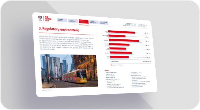 1. Innovative 2. Reach of 3. Regulatory 4. Access to 5. Resilient business Our global offer to business: ecosystem 昀椀nancial activity environment talent and skills infrastructure London and the UK’s competitive 14 strengths supporting economic growth London 66 (9) (UK) 3. Regulatory environment New York City 41 (3) (US) Businesses in the UK bene昀椀t from a widely respected regulatory regime that protects 75 (-7) consumers and increasingly opens doors for global investment professionals. Singapore UK regulators have taken on a secondary objective to promote growth and keep Frankfurt the UK 昀椀nancial services internationally competitive. The FCA and PRA are ensuring 49 (2) (Germany) that domestic FS companies can leverage the latest technology to drive ef昀椀ciencies and productivity, while regulatory coherence with global partners ensures access to Paris 40 (-1) international markets. (France) Hong Kong 53 (-4) Tokyo 45 (0) (Japan) 0 – Least competitive Most competitive – 100 2024 score 2023 score Metrics – Government e昀昀ectiveness – Preferred seat of arbitration – Regulatory quality – Corporate tax rate – Control of corruption – Individual income tax rate – English Common Law – Size of international tax treaty network – Financial centre = political centre – Additional taxes applicable in FS sector – Regulatory sandbox – Tax complexity – Open banking – Controls of the movement of capital and people – Regulatory coherence / equivalence – Services trade restrictiveness index – Sustainable 昀椀nance taxonomy – Cost of regulatory barriers to FS trade Manchester’s city centre – Most favourable regulatory regime for FS – Business complexity (NEW)