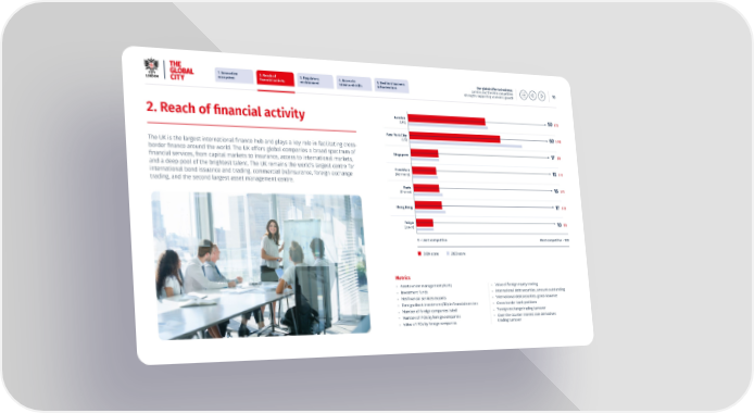1. Innovative 2. Reach of 3. Regulatory 4. Access to 5. Resilient business Our global offer to business: ecosystem 昀椀nancial activity environment talent and skills infrastructure London and the UK’s competitive 10 strengths supporting economic growth London 50 (-2) 2. Reach of 昀椀nancial activity (UK) New York City 60 (-14) (US) The UK is the largest international 昀椀nance hub and plays a key role in facilitating cross- border 昀椀nance around the world. The UK offers global companies a broad spectrum of Singapore 17 (0) 昀椀nancial services, from capital markets to insurance, access to international markets, and a deep pool of the brightest talent. The UK remains the world’s largest centre for Frankfurt 15 (-1) international bond issuance and trading, commercial (re)insurance, foreign exchange (Germany) trading, and the second largest asset management centre. Paris 16 (-2) (France) Hong Kong 17 (-2) Tokyo 10 (0) (Japan) 0 – Least competitive Most competitive – 100 2024 score 2023 score Metrics – Assets under management (AUM) – Value of foreign equity trading – Investment funds – International debt securities, amount outstanding – Net 昀椀nancial services exports – International debt securities, gross issuance – Foreign direct investment (FDI) in 昀椀nancial services – Cross-border bank positions – Number of foreign companies listed – Foreign exchange trading turnover – Number of IPOs by foreign companies – Over-the-counter interest rate derivatives – Value of IPOs by foreign companies trading turnover