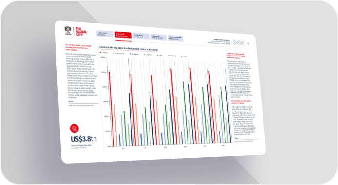 1. Innovative 2. Reach of 3. Regulatory 4. Access to 5. Resilient business Our global offer to business: ecosystem 昀椀nancial activity environment talent and skills infrastructure London and the UK’s competitive 13 strengths supporting economic growth The UK does more cross-border London remains the world’s London is the top cross-border banking centre in the world banking business than any largest centre for FX and OTC other market. London New York City Singapore Frankfurt Paris Hong Kong Tokyo derivatives trading. The UK is the world’s leading 昀椀nancial The UK uses its advantageous US$6tn centre in terms of cross-border position between Asia and the US to banking activity. It had US$5.3tn of be the world leader in FX trading. In cross-border banking claims (15% 2022 London handled a daily average global market share) and US$5.4tn of US$3.8tn in FX trades, double of cross-border liabilities in Q4 New York (the next largest centre) 2022. Japan ranks second with 12% which saw daily average volumes market share, followed by France US$5tn of US$1.9tn. The UK is the leader in and Germany with 11% and 10%, OTC derivatives trading but saw a respectively. The US ranks fourth with 28% fall in volumes between 2019 9% share. Global cross-border bank and 2022 as 昀椀nancial market activity claims fell by US$1.4tn in Q4 2022: reduced with increasing interest rising interest rates and a decline rates. Singapore’s OTC derivatives in the market value of derivatives US$4tn trading increased 34%, but at far led to a drop in cross-border credit. lower volumes. Derivatives-based This trend continues into 2023, investment products have been and although the UK remains the increasingly popular amongst Asian market leader, absolute volumes are retail investors. in decline. The attractiveness of UK equity Source US$3tn markets is in decline. Bank of International Settlements 2023 The number of foreign companies listed in the UK is dropping. 328 foreign companies listed in 2022, down from 352 in 2021. This is in US$2tn contrast to the US where the number of foreign listings increased to reach 1,452. However, London still saw more foreign listings than other European 昀椀nancial centres: nine international 昀椀rms launched their US$1tn IPO in the UK capital. Across all GFCs, the value of foreign IPOs fell by an average of 68% YoY. London saw a US$3.8tn drop of 87% and NYC 90%. Source daily FX trades handled in London in 2022 US$0 World Federation of Exchanges 2023 2017 2018 2019 2020 2021 2022