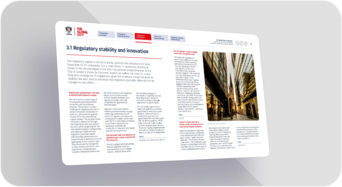 1. Innovative 2. Reach of 3. Regulatory 4. Access to 5. Resilient business Our global offer to business: ecosystem 昀椀nancial activity environment talent and skills infrastructure London and the UK’s competitive 15 strengths supporting economic growth The UK regulatory regime is highly respected on the global stage. 3.1 Regulatory stability and innovation Perceptions of a regulator’s, or government’s, ability to formulate and implement e昀昀ective policy is The regulatory regime in the UK is widely admired and considered the most an important factor in attracting international business. The UK favourable for FS companies. It is a major factor in businesses deciding to is perceived to be one of the locate in the UK and supports the UK’s international competitiveness. In the most e昀昀ective and respected regulatory regimes in the world. The City of London’s Vision for Economic Growth we outline the need for a clear international business community’s long-term strategy for FS regulations, given the emphasis companies place on perception of government stability. We also need to introduce new regulation gradually, allowing time for e昀昀ectiveness has turned negative across nearly all 昀椀nancial centres, changes to take effect. Singapore being the only exception. However, perceptions of UK regulatory e昀昀ectiveness turned positive in 2022 for the 昀椀rst time in three years. Regulatory stalemate, left many companies with regulatory implemented, or begun to Supporting a global 昀椀nance hub with due to Brexit and COVID-19, has been fatigue. As more resources are implement, all currently required a sophisticated domestic market. directed toward compliance with Basel Regulatory Framework addressed with new legislation and policy to permit and promote private The UK is home to a wide range of regulatory changes, costs and standards and they are broadly sector development. A survey of FS companies servicing domestic competition for quali昀椀ed sta昀昀 aligned with US and EU banks. business leaders by the IMD Business consumers and international have increased. School shows the UK saw the The UK has also signed several business. This presents a unique greatest improvement in regulatory Regulators have improved their trade and regulatory cooperation challenge for regulators who aim to perception in 2022. e昀케ciency and e昀昀ectiveness through agreements to ease cross-border protect consumers of domestic FS technology and increasing sta昀昀 business. Memorandums of products, without blocking global Source levels. UK regulators are supportive understanding or free trade 昀椀nance 昀椀rms from international IMD 2023 of innovation in capital markets and agreements (FTA) have been signed capital markets. The UK government were the 昀椀rst to introduce sandboxes with the US, EU, Australia, CPTTP, has tried to address this through London’s Commercial Courts to test 昀椀ntech advancements. India, and Saudi Arabia, to allow the Financial Services and Markets remain a preferred destination for Plantation Lane, City of London Sandboxes streamline the UK 昀椀rms to access those markets. Act 2023, while recognising the role international dispute resolution. introduction of new tech into markets There are ongoing negotiations with that regulation plays in safeguarding Most insurance, derivatives and home of English law, and companies and operational processes. Switzerland, Canada, Australia and international competitiveness. commodities trading contracts based here have access to its top English law provides the legal basis Mexico, as part of FTA negotiations. Regulators have been tasked globally are written in English law, practitioners. Companies based in for many international jurisdictions, International trade and alignment on with ensuring requirements are covering trillions of pounds of the UK also bene昀椀t from formation, standards open routes to growth for Source comprising an estimated 40% of all proportionate in speed and cost and 昀椀nancial transactions each year. restructuring and insolvency laws, UK companies. governing law in global corporate Basel Regulatory Framework Adoption 2023 appropriate to the customer type. English law supports business and UK regulations. arbitration. 77% of UK Commercial They should also be transparent, ambitions, it is visionary and Court claims in 2019 involved at least The UK is aligned with international Source to help markets work better and progressive, and it has the support one party outside England and Wales 昀椀nance standards to ensure improve UK competitiveness. of a robust court, arbitration and and 43% of claims involved parties all interoperability across multiple LegalUK 2023 However, 昀椀nding this balance has disputes infrastructure. London is the located outside England and Wales. markets. UK banks have either