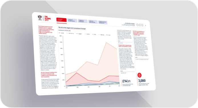 1. Innovative 2. Reach of 3. Regulatory 4. Access to 5. Resilient business Our global offer to business: ecosystem 昀椀nancial activity environment talent and skills infrastructure London and the UK’s competitive 9 strengths supporting economic growth amount of PE and VC investment into The UK government launched The FCA is harnessing 昀椀ntech to The UK is the largest tech ecosystem in Europe 昀椀ntech last year (£61bn). The number ambitious plans to regulate improve regulatory processes cryptocurrency and incorporate of 昀椀ntech investment deals globally and giving UK FS companies a Investment in 昀椀ntech, £bn crypto and distributed peaked in 2021 with 4,355 across competitive edge. our GFCs. There were around 1,000 ledger technology (DLT) into London New York City Singapore Frankfurt Paris Hong Kong Tokyo The FCA is working with the Bank of fewer deals in 2022: the US recorded capital markets. England to reduce the cost of data £80bn most of these (2,142) and the UK was Properly regulated crypto assets collection for FS 昀椀rms. The regulators second with 587. could enhance payments and money Source are harmonising data standards, transfer processes, improving costs updating reporting instructions, and e昀케ciency for consumers. In April and integrating reporting to a more Pitchbook 2023 £70bn 2022, the UK government committed streamlined and e昀케cient data The government is supporting the to launching a regulatory regime collection process. The FCA created need for top tech talent in the UK. for crypto assets and HM Treasury a permanent Digital Sandbox service completed a consultation on their which promotes solutions to complex The UK tech ecosystem is widely regulation in October 2023. That £60bn regulatory challenges like Authorised considered one of the best in the month, the UK government also Push Payment (APP) Fraud, world and this keeps global talent released plans for the regulation greenwashing, and scam detection. 昀氀ocking to innovative UK companies. of 昀椀at-backed cryptocurrencies They are also investing in AI to However, there is a global tech to harness their bene昀椀ts within support supervision work, identify skills gap; High Potential Individual the 昀椀nancial system. Regulating £50bn online scams, and digital intelligence. (HPI) visas were introduced in 2020 crypto assets within the current Source to ensure the UK is able to keep framework allows for associated attracting and retaining the right new technologies, such as DLT, to FCA 2023, Transforming Data Collection 2023 talent. There were 3,000 HPI and be incorporated into established £40bn entrepreneur visas issued in 2022 capital markets operations, such and more than 2,000 issued in the as debt issuance or tokenisation of 昀椀rst half of 2023. The UK government funds. The UK’s leading position in also announced a £118m skills cryptocurrency development has package to develop more homegrown attracted investment companies £30bn from around the world to open talent and attract more skilled people from overseas. o昀케ces in London. Source The UK is Europe’s leading centre £20bn for 昀椀ntech investment and Home O昀케ce 2023 London is one of the world’s top tech ecosystems. Private equity (PE) and venture capital £10bn (VC) 昀椀rms invested £14bn into early stage UK 昀椀ntech companies in 2022, £1bn less than in the year before but £14bn 3,000 three times more than in France, Germany, HK, Japan and Singapore £0 PE and VC investment into HPI and entrepreneur visas combined. The US saw the highest 2017 2018 2019 2020 2021 2022 UK 昀椀ntech last year issued in the UK in 2022