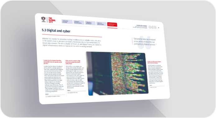 1. Innovative 2. Reach of 3. Regulatory 4. Access to 5. Resilient business Our global offer to business: ecosystem 昀椀nancial activity environment talent and skills infrastructure London and the UK’s competitive 26 strengths supporting economic growth 5.3 Digital and cyber “Demand for data has increased Whether it’s needed for securities trading in milliseconds or reliable video calls, data across nearly all industries, but is the world’s most in-demand commodity. Businesses rely on fast connections and particularly in 昀椀nancial services. ” broad data streams. The UK is a leader in 昀椀ntech, AI and digital 昀椀nance, but London’s digital infrastructure needs to improve in line with increasing demand. London has the slowest 昀椀xed line Cyber security remains a high People in the UK have the highest and mobile internet speeds across priority to combat the risk of level of internet freedom. all GFCs. online fraud. Internet freedom is an important London has the slowest broadband All the GFCs in our analysis have factor when a tech company decides across all GFCs; average speeds in strong cyber security networks, with where to locate its headquarters. New York, Hong Kong and Singapore the UK ranking third behind the US There is little point in setting up shop are more than twice as fast as the and Singapore. Cyber security is a in a country that would not allow UK. The UK also has the slowest growing risk, and the UK insurance your product to be used. The UK has mobile internet speeds amongst industry is leading the way in the highest internet freedom among GFCs. Demand for data has increased insuring those risks, which improves GFCs: it blocks the least amount of across nearly all industries, but security networks. Companies content and does not infringe on particularly in 昀椀nancial services. must meet minimum cyber security consumer rights. Linked to this is Apps and programmes use higher levels in order to take out cyber control of corruption and the UK levels of data to run smoothly, insurance policies. This has driven is strong in this area. It ranks high and the UK needs to provide up the level of security at companies above the US, but below Singapore su昀케cient data e昀케ciencies. The UK that are prone to attacks and and Germany. government launched the National therefore improved cyber security Source Data Strategy to address future for everyone. needs, this is a key aspect of the UK Source Freedom House 2023 remaining competitive. Source CoLC analysis of EIU data CoLC analysis of multiple providers