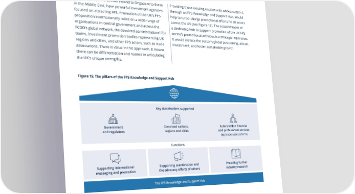 Vision for Economic Growth — a roadmap to prosperity 41 Big move #8 – Supporting coordination and the advocacy The Hubʼs key performance indicators (KPIs) would need efforts of others. The Hub will not do its own to re昀氀ect results in FDI and export promotion across direct advocacy. But it can enable, amplify, and di昀昀erent regions in the UK, a step change in the sector’s Showcase the UK’s financial and professional services highlight the existing work being done across reputation internationally, and the recognition sector on the international stage like never before the country’s bodies, thereby supporting their of value-add across the sector’s multiple stakeholders. coordination, fostering greater partnership, and Benefits associated potentially championing joint delivery. For example, where appropriate the Hub can highlight areas of Between 2024-2030, we estimate the Hub mutual interest across promotion agencies and could contribute: The UK’s competitors, from Ireland to Singapore to those Providing these existing entities with added support, in the Middle East, have powerful investment agencies signpost where collaboration (rather than parallel through an FPS Knowledge and Support Hub, would • Up to £0.7bn of FPS FDI, if we assume an annual e昀昀orts) could be most useful. focused on attracting FPS. Promotion of the UK’s FPS help to turbo-charge promotional e昀昀orts for all actors 122 proposition internationally relies on a wide range of – Providing further industry research. The Hub uptick in FPS FDI worth up to 6% of 2022 levels. across the UK (see Figure 15). The establishment of • Additional investment accrued outside of FDI, could collate existing intelligence being produced organisations in central government and across the a dedicated hub to support promotion of the UK FPS including up to an additional £500m in overseas by other entities, including benchmarking on the FCDO’s global network, the devolved administrations’ FDI sector’s promotional activities is a strategic imperative. 123 VC investment into the UK. UK vs competitor jurisdictions. Where appropriate, teams, investment promotion bodies representing UK It would elevate the sector’s global positioning, attract it can translate this work into “digestible” formats • Up to £24bn increase in FS exports, if we assume regions and cities, and other FPS actors, such as trade investment, and foster sustainable growth. the Hub could contribute an average additional that can be shared directly with investors abroad. associations. There is value in this approach. It means uplift of approximately 0.9% compound annual The Hub could also provide market intelligence, there can be di昀昀erentiation and nuance in articulating trends, and insights that would be objective growth on top of the forecasted growth of UK the UK’s unique strengths. 124 and up-to-date. These resources would help goods and services exports. investors, decision makers and industry leaders • Up to 5,000 additional jobs could be added to bene昀椀t from the latest research and expertise. from increased FDI from 2024-2030, if we Figure 15: The pillars of the FPS Knowledge and Support Hub This would also help the Hub to achieve the other assume an annual uptick in new job creation functions mentioned above (ie, supporting consistent with annual FPS FDI growth worth international messaging, coordination, and up to 6% of 2022 levels. Job estimates assume others’ advocacy e昀昀orts). the same level of investment productivity as 2022, however this may vary depending on 125 the type of additional investment received. In terms of governance, the Hub should be a national, Key stakeholders supported joint initiative of industry and the public sector. The board should have representatives from central and Key actors (non-exhaustive) devolved nation governments, as well as industry Government Devolved nations, Actors within 昀椀nancial Central and devolved national governments; FPS bodies (such as trade associations). It would also industry participants (including trade associations); DBT; and regulators regions and cities and professional services (eg trade associations) be complementary to any recommendations that DSIT; Foreign, Commonwealth, and Development O昀漀ce will be put forward in the Harrington Review on the (FCDO); relevant regulators, including those overseeing Functions 121 government’s approach to attracting FDI. 昀椀nancial services 昀椀rms (see Figure 4). Supporting international Supporting coordination and Providing further the advocacy efforts of others messaging and promotion industry research The FPS Knowledge and Support Hub The key action is to: needs of international markets, capturing the • Establish an FPS Knowledge and Support Hub imaginations of investors and partners. The with the following objectives: hub could also provide a supporting marketing – Supporting international messaging and capability that would develop and implement comprehensive campaigns, working with existing promotion. The hub can highlight the compelling organisations to showcase speci昀椀c verticals or narratives, messaging and collateral of existing key areas of excellence such as the sector’s talent promotion e昀昀orts that showcase the sector’s pool. This could involve capacity building in areas excellence. This can resonate with the evolving of the UK that have limited promotion activities.