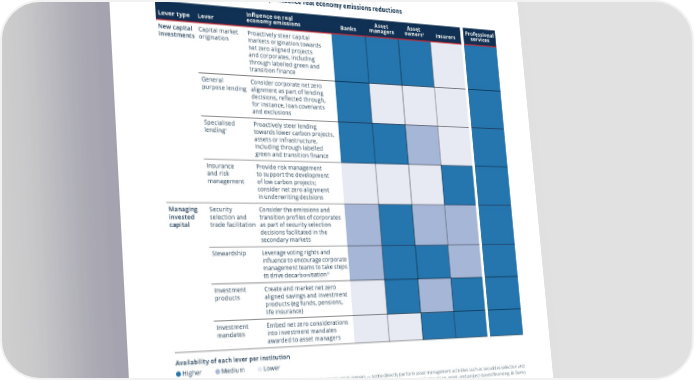 Vision for Economic Growth — a roadmap to prosperity 35 Big move #6 Benefits Key actors (non-exhaustive) The government has said that its Net-Zero and British HMT; the FCA; Department for Energy Security and Energy Security strategies will leverage £100bn in Create the conditions to scale and Net Zero (DESNZ); FRC; BBB; UKIB; UKEF; FPS Industry 103 The right private sector funds between now and 2030. Participants; Green Finance Institute; Impact Investing accelerate finance for a just transitionenabling conditions can help to unlock this capital. Institute; Civil society organisations. Figure 13: Key levers available to help influence real economy emissions reductions Reaching net zero represents the transformational across sectors (eg long-term hydrogen o昀昀take growth opportunity of the 21st century. Finance must agreements and incentives to retro昀椀t steel plants). In昀氀uence on real Asset Asset Professional By providing further detail on its own plans, the UK i 昀氀ow to businesses that have committed to credible Lever typeLevereconomy emissions Banks managers owners Insurers services Government can encourage the mobilisation of transition plans and are delivering against them. New capital Capital market Proactively steer capital private 昀椀nance in support of the transition. Governments have a critical role to play in providing investments originationmarkets origination towards net zero aligned projects unequivocal signals. In the UK, without further policy • Support the scaling up of private 昀椀nance and and corporates, including clarity, the required capital will not mobilise at the de-risking of projects in support of the transition. through labelled green and transition 昀椀nance scale and pace needed. So accelerating 昀椀nancing for Equity investments merit special attention, as the transition 昀椀rst requires an ambitious, visionary General Consider corporate net zero does infrastructure. Building energy e昀漀ciency purpose lending alignment as part of lending and credible domestic energy and industrial policy retro昀椀ts was one area that the CCC highlighted decisions, re昀氀ected through, framework beyond what has been set out to date. Next for instance, loan covenants to be below the necessary level to reach net zero and exclusions there must be regulatory support for interoperable 100 targets, for example. The UK National Infrastructure frameworks and approaches, and scaling-up of a Commission’s 昀椀ve-year report, due in October, will Specialised Proactively steer lending wide variety of 昀椀nancing solutions. Finally, political lendingiitowards lower carbon projects, o昀昀er a crucial analysis of what needs to be done to assets or infrastructure, support for 昀椀nancing the sectors which are critical to 101including through labelled support investment. TheCityUK’s report earlier green and transition 昀椀nance the transition and have set credible transition plans, this year also highlighted recommendations to including those that are “hard-to-abate”, is crucially Insurance Provide risk management mainstream “green” investment and R&D incentives and risk to support the development important. This will help advance decarbonisation 102 for services. Streamlining planning and permitting management of low carbon projects; e昀昀orts. It will also enable growth of economically viable processes, including connections to the grid, would consider net zero alignment in underwriting decisions technologies and solutions to advance the transition over speed up development and implementation of the long term. This e昀昀ort will require collaboration across Managing Security Consider the emissions and the 昀椀nancial system and across value chains (see Figure projects, further attracting investors. Long-dated invested selection and transition pro昀椀les of corporates energy projects match long-term liabilities so the capitaltrade facilitation as part of security selection 13). There must also be a focus on creating a transition decisions facilitated in the that is just, which will require a consideration of climate outcome of Solvency II reform will be critical. There secondary markets will also need to be consideration for the key delivery issues alongside other outcomes, as outlined by the StewardshipLeverage voting rights and role that di昀昀erent authorities and regions will play 99 in昀氀uence to encourage corporate Impact Investing Institute. The key actions are:across the UK.management teams to take steps iii • Provide further clarity and commitment around • Create con昀椀dence among 昀椀nancial institutions to drive decarbonisation Investment Create and market net zero sector-speci昀椀c policies to deliver on net zero that they can support 昀椀nancing the transition productsaligned savings and investment commitments. Private 昀椀nance can invest in the without jeopardising their own Paris-aligned or products (eg funds, pensions, transition only on the bedrock of policy clarity. The net zero targets. Government must lead in setting life insurance) Skidmore Review highlighted investors’ reticence the necessary policy and enabling conditions to Investment Embed net zero considerations mandates into investment mandates to make investments given lack of transparency of achieve net zero targets and support the 昀椀nancial awarded to asset managers the government’s own priorities. The Transition Plan sector to help the real economy transition. This Availability of each lever per institution Taskforce is developing guidance for corporates and means acknowledging that 昀椀rms in energy-intensive Higher Medium Lower 昀椀nancial institutions that will provide the needed industries need to play a role in solving the climate transparency on credible transition plans. These crisis and that a divestment approach will not Clari昀椀cations as provided in the original publication: i. Practices vary across