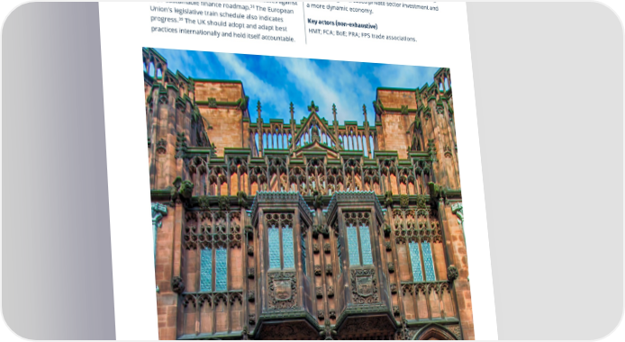 Vision for Economic Growth — a roadmap to prosperity 19 are captured and translated into policy outcomes Benefits (see big move #9). The Partnership Council would Government can use the FPS strategy to provide clarity include representatives from across the sector, and con昀椀dence to industry. In particular, it can show helping generate collaboration to drive growth how it intends to support the sector in growing the through the economy. UK economy over the longer term. This, combined with • Track progress against the strategy. Other re-energised international promotion (see Chapter 5), jurisdictions trace their strategic progress. Singapore, will encourage increased private sector investment and for example, has a rolling set of media releases against a more dynamic economy. 38 their sustainable 昀椀nance roadmap. The European Key actors (non-exhaustive) Union’s legislative train schedule also indicates progress.39 HMT; FCA; BoE; PRA; FPS trade associations. The UK should adopt and adapt best practices internationally and hold itself accountable. The strategy would need to: could be one possible intervention. Another could • Determine the priority focus areas and sectors. be a later career scheme, as mentioned earlier, to E昀昀ective policy requires ruthless prioritisation encourage experienced professionals to work in the regulators — an equivalent of “Now Teach”, perhaps and excellent implementation. By highlighting called “Now Regulate”. speci昀椀c sectors for FPS to support, government • Establish an FPS Partnership Council. An FPS can signal its intentions on key policy areas such Partnership Council would be a strategic partnership as sustainable 昀椀nance and market infrastructure. The more certainty policymakers provide, the between government, industry and regulators. Other industry bodies have previously called for more likely it is that 昀椀rms will have the con昀椀dence collaboration. TheCityUK, for example, called for to invest, innovate, and increase the scale of their UK business. The strategy should also include strategic partnership in its 2017 report “A vision for a transformed, world-leading industry”.37 It consideration of the demand for skills within FPS, helping 昀椀rms to understand how government would act as a forum to capture industry views as government develops its FPS Strategy and plans to champion the provision, upskilling, and implements its workstreams. It could also act retraining of this talent (including through skills John Rylands Library, Manchester as the mechanism through which perspectives forecasting). A major secondment programme between industry, regulators, and government around trade policy and related agreements