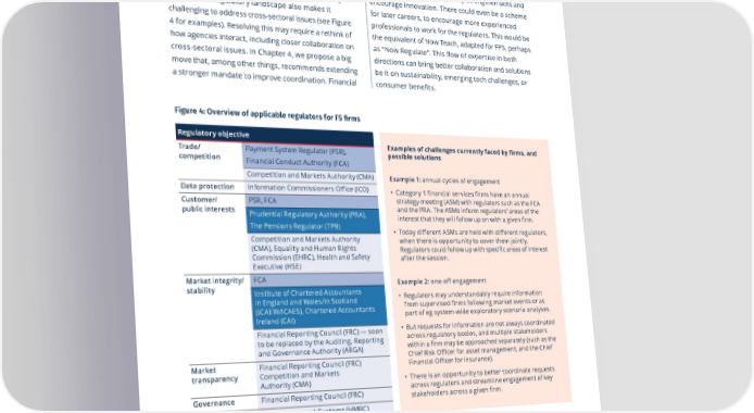 Vision for Economic Growth — a roadmap to prosperity 15 Strengthened reputation for ease of operating. 1. Support the conditions for growth regulators also need license from government to pay UK regulators overseeing FPS 昀椀rms have a justi昀椀ed what’s needed to recruit and retain talent. This is about reputation for high standards, but that needs to the right balance between keeping excellent long- be matched with e昀漀cient processes. This includes term sta昀昀 and bringing in industry expertise. A major Impact by 2030 昀椀nancial services regulatory authorisations, where secondment programme between industry, regulators industry bodies such as TheCityUK have already Government’s clearly defined strategy for UK-based FPS maximises the sector’s contribution and government would also help strengthen skills and 34 Today’s o昀昀ered recommendations for improvement. to UK jobs and economic growth. encourage innovation. There could even be a scheme fragmented regulatory landscape also makes it for later careers, to encourage more experienced challenging to address cross-sectoral issues (see Figure professionals to work for the regulators. This would be Context 4 for examples). Resolving this may require a rethink of the equivalent of Now Teach, adapted for FPS, perhaps If the UK is to grow economically and create prosperity This report focuses on the speci昀椀c conditions for how agencies interact, including closer collaboration on as “Now Regulate”. This 昀氀ow of expertise in both for all its citizens, it must get the “basics” right. Many cross-sectoral issues. In Chapter 4, we propose a big growth that UK-based FPS needs in order to remain directions can bring better collaboration and solutions of these basics are not unique to FPS and represent move that, among other things, recommends extending globally competitive and contribute to a prosperous be it on sustainability, emerging tech challenges, or broader features of a 昀氀ourishing economy. The UK must UK (see Figure 3). It also celebrates the strengths that a stronger mandate to improve coordination. Financial consumer bene昀椀ts. be a place where people want to live and do business. underpin the UK as a global 昀椀nancial centre. This There must be world-class physical infrastructure includes an independent police force in the 昀椀nancial (such as transport links), digital infrastructure (such as district that can help to 昀椀ght 昀椀nancial crime, world-class Figure 4: Overview of applicable regulators for FS firms widely accessible high-speed broadband), and social legal services and a courts system that can deal with Regulatory objective infrastructure (such as excellent healthcare, schools, highly complex economic cases e昀昀ectively. Trade/ Payment System Regulator (PSR), Examples of challenges currently faced by 昀椀rms, and possible solutions and cultural o昀昀ers). Organisations need to prepare for competition future skills and talent challenges. These are all critical Financial Conduct Authority (FCA) features of a 昀氀ourishing, globally competitive economy.Competition and Markets Authority (CMA)Example 1: annual cycles of engagement Data protection Information Commissioners O昀漀ce (ICO) • Category 1 昀椀nancial services 昀椀rms have an annual Customer/ PSR, FCA strategy meeting (ASM) with regulators such as the FCA Figure 3: Conditions for growth of UK-based FPS in support of a prosperous UKpublic interestsPrudential Regulatory Authority (PRA), and the PRA. The ASMs inform regulators’ areas of the interest that they will follow up on with a given 昀椀rm. The Pensions Regulator (TPR) • Today di昀昀erent ASMs are held with di昀昀erent regulators, Competition and Markets Authority Skills and talentStrengthened reputation for ease of operating when there is opportunity to cover them jointly. (CMA), Equality and Human Rights Regulators could follow up with speci昀椀c areas of interest Commission (EHRC), Health and Safety after the session. Executive (HSE) Competitive tax and remuneration policiesA balanced approach to risk-takingMarket integrity/FCAExample 2: one-o昀昀 engagement stability Institute of Chartered Accountants • Regulators may understandably require information in England and Wales/in Scotland from supervised 昀椀rms following market events or as Skills and talent. UK organisations across the public Competitive tax and remuneration policies. FPS 昀椀rms (ICAEW/ICAES), Chartered Accountants part of eg system-wide exploratory scenario analyses. Ireland (CAI) and private sector must be able to easily recruit, and their employees make a huge contribution to the • But requests for information are not always coordinated Financial Reporting Council (FRC) — soon across regulatory bodies, and multiple stakeholders retain, and retrain talent to address the emerging UK Exchequer, with 昀椀rms paying nearly £100bn in taxes to be replaced by the Auditing, Reporting and Governance Authority (ARGA) within a 昀椀rm may be approached separately (such as the 31 needs of their businesses. Digital skills are a particular in 2020. This is roughly equivalent to the combined Market Financial Reporting Council (FRC) Chief Risk O昀漀cer for asset management, and the Chief 32 Financial O昀漀cer for insurance). watchpoint with one in eight roles in the sector now defence and police budgets for 2023-24, worth £106bn.transparencyCompetition and Markets • There is an opportunity to better coordinate requests But if other jurisdictions o昀昀er better deals on tax, tech roles. Some 95% of 昀椀nancial services 昀椀rms identify Authority (CMA) across regulators and streamline engagement of key data analytics and insight skills as a priority, although operations and individuals may move there. The UK GovernanceFinancial Reporting Council (FRC)stakeholders across a given 昀椀rm. supply of these critical technical skills currently falls there
