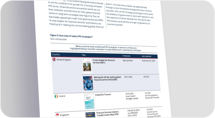 Vision for Economic Growth — a roadmap to prosperity 17 Big move #1 Develop a UK FPS Strategy and FPS Partnership Council to support it A UK FPS Strategy would outline how government intends centre“. It is now time to follow up systematically to set the conditions for growth for a thriving UK-based through a more formalised strategy with clear timelines FPS sector. Financial centres around the world set out and KPIs. This UK FPS Strategy would signal to the world their ambition and direction for their global 昀椀nancial the ambition of government to work with regulators and centre in long-term strategies (see Figure 5). The UK the industry to further develop the UK’s world-class has made a good start, both from government via HMTʼs FPS industry and use that strength to galvanise UK “A new chapter for 昀椀nancial services” and industry via economic growth. TheCityUKʼs “Making the UK the leading global 昀椀nancial Figure 5: Overview of select FPS strategies36 Non-exhaustive Many countries have established FPS strategies. A selection of these are highlighted below, but other examples include Switzerland, Luxembourg, and Japan. Country Title Timescale Last updated United Kingdom A new chapter for 昀椀nancial Not speci昀椀ed Published H2 2021 services (HMT) Making the UK the leading global 2021-2026 H2 2021 昀椀nancial centre (TheCityUK) Central Library Building, Cardi昀昀 Ireland Ireland for Finance 2019-2026 H1 2022 (most recent (via the Update to new regulatory regimes, such as the voluntary code strategic review) Ireland for Finance) A balanced approach to risk-taking. Government, industry, and regulators can adopt a balanced approach of conduct being developed on environmental, social, to risk-taking that seeks to manage rather than eliminate and corporate governance (ESG) ratings and data risk. This can:with the International Regulatory Strategy Group ITM (2016-2020) H2 2022 Singapore Financial Services Industry 35 (IRSG). • Create better economic outcomes for UK citizens They could also jointly experiment on new Transformation Map (ITM) and ITM 2025 (via the launch and business. For example, if UK-based investors product innovations without 昀椀rms feeling they must (2021-2025) of the Financial Services ITM 2025) have all the answers 昀椀rst, as is being demonstrated (including pension funds) were more willing to invest through the 昀椀nancial market infrastructure (FMI) in high-growth, unlisted 昀椀rms as part of a diversi昀椀ed sandbox sponsored by HMT, the FCA, and the BoE. portfolio, then long-term savers could bene昀椀t from United Arab EmiratesBusiness Plan 2007-2024 H1 2023 E昀昀orts such as these do not dilute high standards of greater returns, and UK 昀椀rms could access a deeper (昀椀rst publication (via the Business pool of capital (see Chapter 2).supervision, nor do they reduce 昀椀rm compliance. But in 2007) Plan 2023/2024) • Unlock innovation across regulators and supervised they do streamline the path for 昀椀rms and regulators to innovate. 昀椀rms. For example, regulators could increase their appetite to assess industry proposals for inclusion in NB cover images re昀氀ect most recent publication, if the strategy is an update in a series