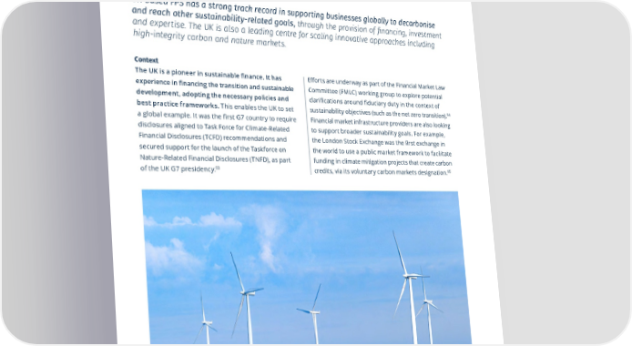 Vision for Economic Growth — a roadmap to prosperity 33 The investment gap to 昀椀nance the transition to net 4. Anchor the UK as a leader Demonstrating leadership in sustainable 昀椀nance can zero and the protection of nature and biodiversity help to consolidate the UK’s role as the “go-to” partner is daunting. In 2021, the International Energy Agency in sustainable finance for 昀椀rms and countries when it comes to transitioning (IEA) estimated that annual clean energy investment to net zero, protecting biodiversity, and delivering on worldwide would need to more than triple by 2030, other sustainability-related goals. It is also worth noting 96 and a recent estimate puts the 昀椀gure at US$4.6tn. that the ultimate success of the UK as a centre for But capital 昀氀ows today are nowhere near the levels Impact by 2030 sustainable 昀椀nance will be in no small part determined required to transition to a more sustainable energy UK-based FPS has a strong track record in supporting businesses globally to decarbonise by the overall vibrancy of its capital markets. As the UK and reach other sustainability-related goals, through the provision of financing, investment system (see Figure 12). One estimate from 2022 put considers a range of reforms to protect and enhance the the UK’s investment gap for the transition as being up and expertise. The UK is also a leading centre for scaling innovative approaches including competitiveness of its capital markets more broadly, it 97 Also, within the UK alone, there is to £111bn by 2030. high-integrity carbon and nature markets. is important that these are developed in lockstep with an estimated 昀椀nancing gap to meet nature-related the policy measures needed to seize the opportunity of outcomes targeted in UK policy of at least £44-97bn anchoring the UK as a leader in sustainable 昀椀nance. 98 Context To close these gaps, the UK needs to unlock by 2032. E昀昀orts are underway as part of the Financial Market Law The UK is a pioneer in sustainable 昀椀nance. It has public and private capital at scale through predictable experience in 昀椀nancing the transition and sustainable Committee (FMLC) working group to explore potential and durable energy and industrial policies. development, adopting the necessary policies and clari昀椀cations around 昀椀duciary duty in the context of 94 best practice frameworks. This enables the UK to set sustainability objectives (such as the net zero transition). Financial market infrastructure providers are also looking a global example. It was the 昀椀rst G7 country to require Figure 12: Global clean energy investments — current versus required to reach net zero by 2050 to support broader sustainability goals. For example, disclosures aligned to Task Force for Climate-Related US$ trillion (2022) the London Stock Exchange was the 昀椀rst exchange in Financial Disclosures (TCFD) recommendations and Level of global clean energy investment required annually to reach net zero by 2050 ~4.6 secured support for the launch of the Taskforce on the world to use a public market framework to facilitate Nature-Related Financial Disclosures (TNFD), as part funding in climate mitigation projects that create carbon 93 95 of the UK G7 presidency. credits, via its voluntary carbon markets designation. ~1.7 ~1.6 ~1.4 ~1.2 ~1.3 ~1.1 ~1.1 ~1.1 2016 2017 2018 2019 2020 2021 2022 2023e 2030 O昀昀shore windfarm at Redcar NB 2030 昀椀gures refer to IEAʼs Net Zero by 2050 Scenario Source: IEA (2023), World Energy Investment 2023, IEA, Paris https://www.iea.org/reports/world-energy-investment-2023, License: CC BY 4.0