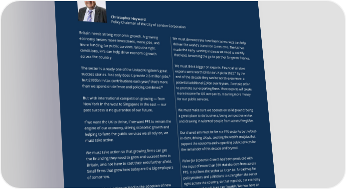 Vision for Economic Growth — a roadmap to prosperity 5 Foreword Foreword\ Nicholas Lyons Christopher Hayward The Rt. Hon The Lord Mayor of the City of London Policy Chairman of the City of London Corporation The UK has enjoyed numerous periods of strong the world’s pre-eminent 昀椀nancial centre under Britain needs strong economic growth. A growing We must demonstrate how 昀椀nancial markets can help economic growth in the past. After World War Two, increasing threat. The London Stock Exchange economy means more investment, more jobs, and deliver the world’s transition to net zero. The UK has 1 the nation saw a sustained period of economic growth raised £16.3bn in 2017 — but, in 2021 the 昀椀gure more funding for public services. With the right made the early running and now we need to solidify 27 and near-full employment until the 1970s. But there’s was just £10.5bn. Meanwhile, London was not conditions, FPS can help drive economic growth that lead, becoming the go-to partner for green 昀椀nance. nothing preordained about growth: a peak won’t the clear leader in the City of London Corporation’s across the country. necessarily follow this trough we 昀椀nd ourselves in, annual benchmarking report for the 昀椀rst time ever We must think bigger on exports. Financial services post-Covid. And while the City has for so long supported this year — instead ranking joint 昀椀rst with New York.The sector is already one of the United Kingdom’s great 11 By the exports were worth £91bn to UK plc in 2022. 8 the UK’s prosperity, there’s no guarantee that will success stories. Not only does it provide 2.5 million jobs,end of the decade they can be worth even more, a 9 but £100bn in tax contributions each year; that’s more always be the case. The right conditions must prevail — These challenges are a wake-up call, and we cannot potential additional £24bn over 6 years, if we take action 10 than we spend on defence and policing combined. keep hitting the “snooze” button. to promote our exporting 昀椀rms. More exports will create good levels of investment, digital infrastructure, agile more income for UK companies, meaning more money regulation, a coherent 昀椀scal regime, a supportive I’m happy to say that change is already underway to But with international competition growing — from for our public services. political environment — or the sector will not be able New York in the west to Singapore in the east — our to fuel our economy in the way it must to support 21st boost the FPS sector. Recent reviews including Hill, century industries.Kalifa, Austin and Kent have set wheels in motion. past success is no guarantee of our future.We must make sure we operate on solid ground: being a great place to do business, being competitive on tax Organisations like TheCityUK, UK Finance, the Association If we want the UK to thrive, if we want FPS to remain the and drawing in talented people from across the globe. At the moment, there are three key challenges of British Insurers, the Investment Association, the engine of our economy, driving economic growth and Financial Services Skills Commission, and the Capital hampering the UK economy and the 昀椀nancial and helping to fund the public services we all rely on, we professional services (FPS) sector in particular.Markets Industry Taskforce — to name just a few — Our shared aim must be for our FPS sector to be the best- must take action. in-class, driving UK plc, creating the wealth and jobs that are helping create real momentum. And the Financial support the economy and supporting public services for GDP growth rates and labour productivity are not what Services and Markets Act and Mansion House Reforms We must take action so that growing 昀椀rms can get the remainder of this decade and beyond. they once were. Between 1995 and 2005, GDP growth are tangible products of this work. But we need to have the 昀椀nancing they need to grow and succeed here in and average wages grew by 29% and 30% respectively a long-term strategy for FPS towards which we in the in real terms. But between 2010 and 2020, they grew by City can all work to boost the UK’s competitiveness.Britain, and not have to cast their nets further a昀椀eld. Vision for Economic Growth has been produced with 3 Between 2008 and 2020, the UK saw Small 昀椀rms that grow here today are the big employers the input of more than 300 stakeholders from across just 8% and 4%. productivity growth of just 0.4% per year, compared to of tomorrow. This “roadmap” builds on all of this — focusing on the FPS. It outlines the sector as it can be. A roadmap for 4 an average of 0.9% in the 25 richest OECD countries. policymakers and politicians to strengthen the sector “Big Moves” we need to make over the ensuing months and years to catalyse further change. There’s no quick We must take action to lead in the adoption of new right across the country, so that together, our economy One study suggests GDP growth booms are nine times technology, not follow on behind. We must give our can grow and our future can 昀氀ourish. We now have an 昀椀x for sustained growth, prosperity and international 5 more likely with a higher level of business investment.regulators the licence to operate at the cutting edge opportunity to back British success, promote our world- competitiveness. So, this is a long-term approach But UK business investment as a proportion of GDP and to lead on arti昀椀cial intelligence (AI), machine leading sectors, and drive economic growth. We can that will extend well beyond my term as Lord Mayor remains lower than in almost all other G7 economies — learning, and other technologies. By setting global and we must take it. and across the next Parliament. I’m con昀椀dent if all and it’s been this way for decades.6 the key stakeholders pull together and follow these standards, we can lead the way, providing a competitive recom
