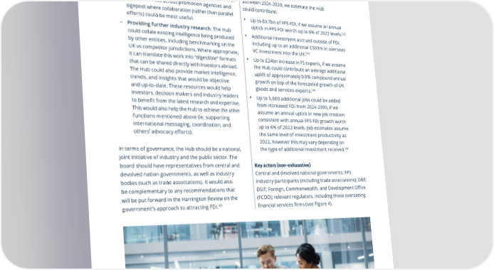 Vision for Economic Growth — a roadmap to prosperity 41 Big move #8 – Supporting coordination and the advocacy The Hubʼs key performance indicators (KPIs) would need efforts of others. The Hub will not do its own to re昀氀ect results in FDI and export promotion across direct advocacy. But it can enable, amplify, and di昀昀erent regions in the UK, a step change in the sector’s Showcase the UK’s financial and professional services highlight the existing work being done across reputation internationally, and the recognition sector on the international stage like never beforethe country’s bodies, thereby supporting their of value-add across the sector’s multiple stakeholders. coordination, fostering greater partnership, and Benefits associated potentially championing joint delivery. For example, where appropriate the Hub can highlight areas of Between 2024-2030, we estimate the Hub mutual interest across promotion agencies and could contribute: The UK’s competitors, from Ireland to Singapore to those Providing these existing entities with added support, in the Middle East, have powerful investment agencies signpost where collaboration (rather than parallel through an FPS Knowledge and Support Hub, would • Up to £0.7bn of FPS FDI, if we assume an annual e昀昀orts) could be most useful. focused on attracting FPS. Promotion of the UK’s FPS help to turbo-charge promotional e昀昀orts for all actors 122 proposition internationally relies on a wide range of – Providing further industry research. The Hub uptick in FPS FDI worth up to 6% of 2022 levels. across the UK (see Figure 15). The establishment of • Additional investment accrued outside of FDI, could collate existing intelligence being produced organisations in central government and across the a dedicated hub to support promotion of the UK FPS including up to an additional £500m in overseas by other entities, including benchmarking on the FCDO’s global network, the devolved administrations’ FDI sector’s promotional activities is a strategic imperative. 123 VC investment into the UK. UK vs competitor jurisdictions. Where appropriate, teams, investment promotion bodies representing UK It would elevate the sector’s global positioning, attract it can translate this work into “digestible” formats • Up to £24bn increase in FS exports, if we assume regions and cities, and other FPS actors, such as trade investment, and foster sustainable growth.the Hub could contribute an average additional that can be shared directly with investors abroad. associations. There is value in this approach. It means uplift of approximately 0.9% compound annual The Hub could also provide market intelligence, there can be di昀昀erentiation and nuance in articulating trends, and insights that would be objective growth on top of the forecasted growth of UK the UK’s unique strengths. 124 and up-to-date. These resources would help goods and services exports. investors, decision makers and industry leaders • Up to 5,000 additional jobs could be added to bene昀椀t from the latest research and expertise. from increased FDI from 2024-2030, if we Figure 15: The pillars of the FPS Knowledge and Support Hub This would also help the Hub to achieve the other assume an annual uptick in new job creation functions mentioned above (ie, supporting consistent with annual FPS FDI growth worth international messaging, coordination, and up to 6% of 2022 levels. Job estimates assume others’ advocacy e昀昀orts). the same level of investment productivity as 2022, however this may vary depending on 125 the type of additional investment received. In terms of governance, the Hub should be a national, Key stakeholders supported joint initiative of industry and the public sector. The board should have representatives from central and Key actors (non-exhaustive) devolved nation governments, as well as industry Government Devolved nations, Actors within 昀椀nancial Central and devolved national governments; FPS bodies (such as trade associations). It would also industry participants (including trade associations); DBT; and regulatorsregions and citiesand professional services (eg trade associations)be complementary to any recommendations that DSIT; Foreign, Commonwealth, and Development O昀漀ce will be put forward in the Harrington Review on the (FCDO); relevant regulators, including those overseeing Functions 121 government’s approach to attracting FDI. 昀椀nancial services 昀椀rms (see Figure 4). Supporting international Supporting coordination and Providing further the advocacy efforts of others messaging and promotionindustry research The FPS Knowledge and Support Hub The key action is to:needs of international markets, capturing the • Establish an FPS Knowledge and Support Hub imaginations of investors and partners. The with the following objectives:hub could also provide a supporting marketing – Supporting international messaging and capability that would develop and implement comprehensive campaigns, working with existing promotion. The hub can highlight the compelling organisations to showcase speci昀椀c verticals or narratives, messaging and collateral of existing key areas of excellence such as the sector’s talent promotion e昀昀orts that showcase the sector’s pool. This could involve capacity building in areas excellence. This can resonate with the evolving of the UK that have limited promotion activities.