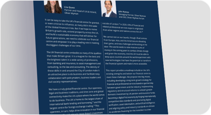Vision for Economic Growth — a roadmap to prosperity 7 Introduction Industry leads for this report The City of London Corporation is particularly grateful to the expertise and commitment of the industry leads who helped to shape the chapters and overall report throughout the project. Vivienne Artz Lisa Quest John Romeo Senior Data Strategy and Privacy Policy Advisor to the Centre for Information Policy Leadership Managing Partner, Oliver Wyman Partner and Head of UK & Ireland, and CEO, Oliver Wyman Forum Oliver Wyman Katharine Braddick Group Head of Strategic Policy and Advisor to the Group CEO, Barclays It can be easy to take the UK’s 昀椀nancial centre for granted, 15 In 2020, 43% of 昀椀nancial and outside of London. or even criticise its in昀氀uence, as many did in the wake related professional services exports originated Rebekah Clement 16 Corporate A昀昀airs Director, Lloyd’s of the Global Financial Crisis. But if we hope to revive from other regions and nations across the UK. Britain’s growth rate, extend prosperity across the UK, Huw Evans We cannot rest on our laurels, though. Rival centres and build a sustainable economy that will deliver for from Europe, Asia, and the Americas are elevating Partner, KPMG future generations, we need to celebrate our 昀椀nancial centre and empower it to play a leading role in meeting their game, and new challenges are knocking at the the biggest challenges of our time. door. The world needs to raise massive sums of Danny Lopez money in the coming years to combat climate change CEO, Glasswall and green the economy. And the UK must be able to The UK 昀椀nancial centre embodies so many of the qualities Neylin Mutlu that make Britain great. It is a magnet for the best and keep up as countries around the world experiment with Global Business Manager, Center for Carbon Transition and Sustainable Solutions, J.P. Morgan new technologies that have the potential to transform the brightest talent in a wide variety of professions, from banking and insurance, to asset management and the 昀椀nancial system and make it more accessible. consulting, to the law and accounting. The density of Sheila Nicoll Senior Public Policy Advisor, Schroders these skills in and around the City of London make it This report provides a roadmap to build on the UK’s existing strengths and bolster our 昀椀nancial centre to an attractive place to do business and facilitate easy Chris Woolard collaboration with policymakers, business leaders and meet these challenges. We propose nine big moves, Partner, Chair Global Regulatory Network, EY civil society representatives. including developing a long-term growth strategy for 昀椀nancial and professional services based on partnership With additional thanks to Baroness Kay Swinburne for her contribution in the early stages of the report between government and the industry; implementing We have a truly global 昀椀nancial centre. Our openness, legal and business traditions, and time zone and global regulatory and structural reforms to unleash greater prior to her ennoblement. domestic investment by UK pension and insurance funds; connectivity make the UK a place where the world comes We are also grateful to Allen & Overy for providing legal advisory services. Special thanks to James Roe, Bob Penn, to do business. The UK is home to the largest share of becoming a digital 昀椀rst economy by forging internationally 12 and the Nikki Johnstone, Matthew Townsend, Jane Finlayson-Brown, Damian Carolan, Jonathan Benson, Tom Roberts, international bank lending and borrowing, competitive data standards and promoting digital 13 This Jessica Kerslake, and Tamara Cizeika. largest centre for foreign exchange trading. veri昀椀cation, asset tokenisation, and arti昀椀cial intelligence; openness, in turn, helps drive innovation in our 昀椀nancial and aligning policy and industry standards on climate ecosystem. The UK attracts more 昀椀ntech investment to accelerate 昀椀nancing for the transition to a low- than the next ten European countries combined, and carbon economy. 14 This ability to globally ranks second only to the US. attract money and talent is an asset few rival centres The opportunity is there for the taking. It’s time for can match. government and industry to join together and unleash the power of 昀椀nance to create a more prosperous and These strengths extend bene昀椀ts far beyond London. sustainable future for all of us. Financial and related professional services employ one in every 13 workers in this country, two thirds of them