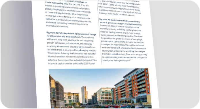 Vision for Economic Growth — a roadmap to prosperity 9 representatives from industry alongside government Executive summary Government Pension Schemes (LGPS) increase their and regulators, could help design and implement allocation to unlisted equities to 10% (which the the strategy. government is consulting on at time of publication), and if UK DC schemes allocate at least 5% of their Raise investment levels 17 Reforms to Solvency default funds to unlisted equities. For greater prosperity and growth, the UK needs II could potentially unlock £100bn from the insurance higher long-term returns for savers and more and long-term savings sector over the coming decade 18 Capital will only 昀氀ow if these regulatory investment in its 昀椀rms and infrastructure to from 2024. create high quality jobs. The UK’s FPS 昀椀rms are reforms are accompanied by profound cultural change. leaders in providing capital to 昀椀rms and projects In addition, there will need to be a signi昀椀cant increase in savings levels into DC retirement schemes. globally. Deploying this expertise more consistently at home will pay dividends. It has the potential Big move #3: maximise the effectiveness of every to improve returns for long-term savers, provide capital for businesses to pursue new opportunities, pound of government support for growth companies. Government deploys 昀椀nancial support across the and create compelling investment options for international investors. economy, nationally and locally. Clarifying how these disparate funding schemes align to major strategic Big move #2: fully implement a programme of change outcomes would provide strong signalling. The clearer These objectives are delivered through a series of Nearly everyone in the UK interacts with 昀椀nancial for UK pension and insurance funds. These reforms the priorities, the greater the chance of leveraging in and professional services (FPS) on a daily basis. For “big moves”, or strategic reforms, that are designed private capital. Operationally, 昀椀rms also 昀椀nd it di昀漀cult will bene昀椀t long-term savers while also supporting some consumers, those dealings may consist of daily to create transformational change over time. Often growth companies, infrastructure, and the wider to navigate the opportunities. This could be made much purchases using a credit/debit card or keeping money they amplify existing recommendations and calls for economy. Government should progress the reforms more user-friendly with a “product and institution-neutral” securely in current accounts. For others, it is about change that have been brought forward by various for which there is strong and broad ranging support. advisory team and portal that would help 昀椀rms navigate milestone events such as taking out insurance for a new industry bodies, government reviews, and civil society the choices available to them. There is also an opportunity This includes Solvency II reform and a new Value for car, a mortgage for a new home, or a savings product to organisations. We expect these big moves to deliver to explore creating investment vehicles that could provide Money framework for de昀椀ned contributions (DC) 19 prepare for retirement. Individuals and businesses may even bigger impact than the numbers suggest as the a destination for long-term capital. schemes. Government has indicated that up to £75bn seek investment advice, legal expertise, or other forms bene昀椀ts they will provide reach far beyond FPS. Through in private capital could be unlocked by 2030 if Local of professional services. FPS supports UK businesses the role of FPS as an enabler, we believe these initiatives to stay on top of their 昀椀nances, invest in order to drive will deliver a signi昀椀cant knock-on impact on overall productivity, manage risk, and create jobs in the UK and growth for the UK economy. abroad. Regardless of the speci昀椀c interaction, FPS boils down to ensuring people can get through good times Support the conditions for growth Government, regulators, and the industry must support and bad, and plan for the future. It is vital that we have an industry that supports consumers and businesses the conditions for growth. This is about getting the basics right across the country and through all stages in right. Some conditions, such as world-class infrastructure, their lives.apply to the whole economy. Others are speci昀椀c to the FPS sector and can be far more e昀昀ectively implemented This report highlights 昀椀ve critical objectives as part of a wider FPS strategy (see below). to strengthen UK-based FPS as a driver of jobs and prosperity:Big move #1: develop a long-term strategy for UK- • Support the conditions for growthbased FPS to support growth (an “FPS strategy”). • Raise investment levelsThe strategy should outline the policy priorities that • Turn the UK into a digital-昀椀rst economygovernment, regulators and industry will focus on to support a competitive FPS industry to drive growth. • Anchor the UK as a leader in This would include how FPS can best support the sustainable 昀椀nancegrowth of potential areas of competitive advantage • Develop world-class promotion such as sustainable 昀椀nance, and emerging technologies and interconnectivitysuch as tokenisation. Clear timelines and routine Leeds Docks, Leeds reporting will be key. An FPS Partnership Council, with