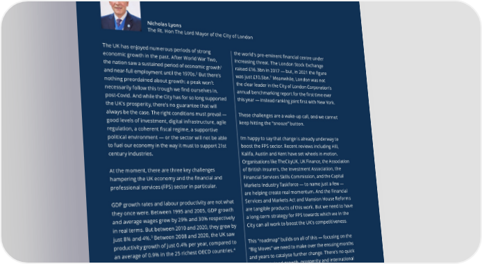Vision for Economic Growth — a roadmap to prosperity 5 Foreword Foreword\ Nicholas Lyons Christopher Hayward The Rt. Hon The Lord Mayor of the City of London Policy Chairman of the City of London Corporation The UK has enjoyed numerous periods of strong the world’s pre-eminent 昀椀nancial centre under Britain needs strong economic growth. A growing We must demonstrate how 昀椀nancial markets can help economic growth in the past. After World War Two, increasing threat. The London Stock Exchange economy means more investment, more jobs, and deliver the world’s transition to net zero. The UK has 1 the nation saw a sustained period of economic growth raised £16.3bn in 2017 — but, in 2021 the 昀椀gure more funding for public services. With the right made the early running and now we need to solidify 2 7 and near-full employment until the 1970s. But there’s was just £10.5bn. Meanwhile, London was not conditions, FPS can help drive economic growth that lead, becoming the go-to partner for green 昀椀nance. nothing preordained about growth: a peak won’t the clear leader in the City of London Corporation’s across the country. necessarily follow this trough we 昀椀nd ourselves in, annual benchmarking report for the 昀椀rst time ever We must think bigger on exports. Financial services post-Covid. And while the City has for so long supported this year — instead ranking joint 昀椀rst with New York. The sector is already one of the United Kingdom’s great 11 By the exports were worth £91bn to UK plc in 2022. 8 the UK’s prosperity, there’s no guarantee that will success stories. Not only does it provide 2.5 million jobs, end of the decade they can be worth even more, a 9 but £100bn in tax contributions each year; that’s more always be the case. The right conditions must prevail — These challenges are a wake-up call, and we cannot potential additional £24bn over 6 years, if we take action 10 than we spend on defence and policing combined. keep hitting the “snooze” button. to promote our exporting 昀椀rms. More exports will create good levels of investment, digital infrastructure, agile more income for UK companies, meaning more money regulation, a coherent 昀椀scal regime, a supportive I’m happy to say that change is already underway to But with international competition growing — from for our public services. political environment — or the sector will not be able New York in the west to Singapore in the east — our to fuel our economy in the way it must to support 21st boost the FPS sector. Recent reviews including Hill, century industries. Kalifa, Austin and Kent have set wheels in motion. past success is no guarantee of our future. We must make sure we operate on solid ground: being a great place to do business, being competitive on tax Organisations like TheCityUK, UK Finance, the Association If we want the UK to thrive, if we want FPS to remain the and drawing in talented people from across the globe. At the moment, there are three key challenges of British Insurers, the Investment Association, the engine of our economy, driving economic growth and Financial Services Skills Commission, and the Capital hampering the UK economy and the 昀椀nancial and helping to fund the public services we all rely on, we professional services (FPS) sector in particular. Markets Industry Taskforce — to name just a few — Our shared aim must be for our FPS sector to be the best- must take action. in-class, driving UK plc, creating the wealth and jobs that are helping create real momentum. And the Financial support the economy and supporting public services for GDP growth rates and labour productivity are not what Services and Markets Act and Mansion House Reforms We must take action so that growing 昀椀rms can get the remainder of this decade and beyond. they once were. Between 1995 and 2005, GDP growth are tangible products of this work. But we need to have the 昀椀nancing they need to grow and succeed here in and average wages grew by 29% and 30% respectively a long-term strategy for FPS towards which we in the in real terms. But between 2010 and 2020, they grew by City can all work to boost the UK’s competitiveness. Britain, and not have to cast their nets further a昀椀eld. Vision for Economic Growth has been produced with 3 Between 2008 and 2020, the UK saw Small 昀椀rms that grow here today are the big employers the input of more than 300 stakeholders from across just 8% and 4%. productivity growth of just 0.4% per year, compared to of tomorrow. This “roadmap” builds on all of this — focusing on the FPS. It outlines the sector as it can be. A roadmap for 4 an average of 0.9% in the 25 richest OECD countries. policymakers and politicians to strengthen the sector “Big Moves” we need to make over the ensuing months and years to catalyse further change. There’s no quick We must take action to lead in the adoption of new right across the country, so that together, our economy One study suggests GDP growth booms are nine times technology, not follow on behind. We must give our can grow and our future can 昀氀ourish. We now have an 昀椀x for sustained growth, prosperity and international 5 more likely with a higher level of business investment. regulators the licence to operate at the cutting edge opportunity to back British success, promote our world- competitiveness. So, this is a long-term approach But UK business investment as a proportion of GDP and to lead on arti昀椀cial intelligence (AI), machine leading sectors, and drive economic growth. We can that will extend well beyond my term as Lord Mayor remains lower than in almost all other G7 economies — learning, and other technologies. By setting global and we must take it. and across the next Parliament. I’m con昀椀dent if all and it’s been this way for decades.6 the key stakeholders pull together and follow these standards, we can lead the way, providing a competiti