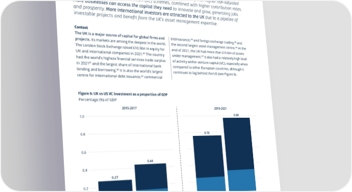 Vision for Economic Growth — a roadmap to prosperity 21 2. Raise investment levels Impact by 2030 Long-term savers in the UK are better prepared for retirement, with higher risk-adjusted net returns in defined contribution (DC) schemes, combined with higher contribution rates. More businesses can access the capital they need to innovate and grow, generating jobs and prosperity. More international investors are attracted to the UK due to a pipeline of investable projects and benefit from the UK’s asset management expertise. Context 44 45 (re)insurance, and foreign exchange trading, and The UK is a major source of capital for global 昀椀rms and 46 projects. Its markets are among the deepest in the world. the second largest asset management centre. At the end of 2021, the UK had more than £11.6tn of assets The London Stock Exchange raised £10.5bn in equity for 40 47 UK and international companies in 2021. The country under management. It also had a relatively high level had the world’s highest 昀椀nancial services trade surplus of activity within venture capital (VC), especially when 41 and the largest share of international bank in 2021 compared to other European countries, although it 42 lending and borrowing. It is also the world’s largest continues to lag behind the US (see Figure 6). 43 centre for international debt issuance, commercial Figure 6: UK vs US VC investment as a proportion of GDP Percentage (%) of GDP 2015-2017 2019-2021 1.0 0.98 Today’s domestic capital pools are not maximised UK. As of 2021, there were more than 15 times as many for UK savers, nor the broader UK economy. The savers accumulating in DC schemes than accumulating 0.8 0.76 51 There is also an estimated 35% gender overriding purpose of pension schemes is to pay savers in DB schemes. an income in their retirement. Insurance funds also pension gap across DB and DC schemes, with men 52 having more in savings. 0.6 have a key role to play in supporting long-term savers. Where this goal aligns with risk-adjusted net returns, Better returns on DC savings schemes could 0.44 there is signi昀椀cant opportunity to unlock capital to fuel begin to 昀椀ll part of the long-term savings gap 0.4 economic growth. UK pension funds have the highest allocation to bonds and lowest allocation to equities for pension savers. Analysis by Oliver Wyman and 0.27 48 of any comparable pension system in the world. the British Business Bank suggests that if default 0.2 They also have lower contribution rates by employers funds followed a lifestyle approach and allocated and employees alike. In 2019, employers on average 5% of capital to VC or Growth Equity (GE), a 22-year- contributed to de昀椀ned bene昀椀t (DB) schemes at a rate 6 old saver could achieve up to 12% increase in their total 49 53 Beyond bene昀椀ts to long-term times higher than to de昀椀ned contribution (DC) schemes. 0 retirement savings. UK US UK US DC savers are also, generally, not contributing enough to savers, the UK’s high-growth businesses would also Seed Early stage VC Later stage VC their pension schemes. As of 2019, 53% of private sector bene昀椀t if a proportion of these investments were pension participants across schemes had contributions allocated to UK businesses. The BBB estimates that Source: 昀椀gures as published by the BBB. Based on BBB user de昀椀ned search and calculations of PitchBook and World Bank data. BBB (2022): https://www.british-business-bank.co.uk/small-business-equity-tracker-2022/. 50 Collectively, these of less than 8% of their earnings. barriers to 昀椀nance could be preventing up to 270,000 dynamics mean that most DC schemes are inadequate for small and medium-sized enterprises (SMEs) from 54 More capital could therefore providing a comfortable retirement. This is signi昀椀cant innovating every year. help to encourage more innovation across the country. given the role that DC schemes play and will play in the