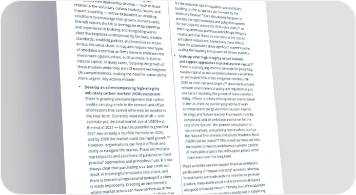 Vision for Economic Growth — a roadmap to prosperity 37 Big move #7 Scale high-integrity, innovative markets and be at the forefront of new investment opportunities Sustainable 昀椀nance markets are innovating fast. for the potential role of regulation around VCMs, building on the proposals put forward by the How quickly new approaches develop — such as those 105 Skidmore Review. related to the voluntary carbon markets, nature, and Care should also be given to impact investing — will be dependent on enabling provide the right incentives and policy frameworks conditions to encourage their growth. In many cases, 106 for participants across the VCM value chain, so this will require the UK to leverage its deep expertise that they promote, purchase and sell high-integrity and experience in building and integrating world- credits and that these do not come at the cost of class marketplaces underpinned by fair laws, credible emissions reductions. Collectively these e昀昀orts standards, enabling policies and incentivised action have the potential to drive signi昀椀cant momentum for across the value chain. It may also require new types scaling the liquidity and growth of carbon markets. of specialist expertise as 昀椀rms move to embrace new • Scale-up other high-integrity nature markets investment opportunities, such as those related to 107 and support approaches to protect natural capital. natural capital. In many cases, fostering the growth of There is a strong argument to be made for protecting these markets while they are still nascent will heighten natural capital, as nature-based solutions can achieve UK competitiveness, making the need for action all the an estimated 37% of the mitigation needed until more urgent. Key actions include: 108 2030 to meet net zero targets. Uncertainty around • Develop an all-encompassing high-integrity relevant environmental policy and regulation is just voluntary carbon markets (VCM) ecosystem. one factor impeding the growth of nature markets There is growing acknowledgement that carbon today. If there is to be a thriving nature market based credits can play a role in the removal and o昀昀set in the UK, then the current programme of work of emissions that cannot otherwise be avoided in summarised in the government’s Green Finance Strategy and Nature Markets Framework must be the near term. Currently relatively small — one completed, and an ambitious course set for the estimate put the total market size at US$2bn at the end of 2021 — it has the potential to grow fast. rest of the decade. The planned consultation on 2021 was already a fourfold increase on 2020, nature markets, and piloting new markets, such as the Natural Environment Investment Readiness Fund 104 and by 2030 the market could see rapid growth. 109 (NEIRF) will be crucial. E昀昀orts such as these will help However, organisations can 昀椀nd it di昀漀cult and the market to mature and develop a greater pipeline costly to navigate the market. There are multiple marketplaces and a plethora of guidance on “best of investable projects that will support private sector practice” approaches and principles of use. It is not investment over the long term. always clear that purchasing a carbon credit will These activities can also support 昀椀nancial institutions result in meaningful emissions reductions, and there is concern of reputational damage if a claim participating in “impact investing” activities, whereby Glasgow, host of the COP26 Climate Conference is made improperly. Creating an environment “investments are made with the intention to generate Benefits Key actors (non-exhaustive) positive, measurable social and environmental impact where market actors can have con昀椀dence in the 110 Finally, the UK’s established With the right enabling conditions in place and impactful DESNZ; the Department for Environment, Food alongside a 昀椀nancial return”. integrity of the market; how the use of o昀昀sets may complement their transition commitments; and strengths in insurance can play a pivotal role in supporting mobilisation of government 昀椀scal and policy support, and Rural A昀昀airs (DEFRA); the UK ETS Authority; and accelerating the bene昀椀ts that these new markets will how they should disclose and account for their use the private sector could play a meaningful role in driving FPS Industry Participants; Green Finance Institute; bring. For example, the London market could develop the substantial economic opportunity of VCM and closing Impact Investing Institute; civil society organisations. is key. As a priority, the government can remove insurance products to protect against project failure the 昀椀nancing gap for achieving nature-related outcomes the complexity and barriers that are preventing participation in the market, including consideration or fraud risks. targeted in UK policy, which one estimate puts between 111 at least £44bn and £97bn.
