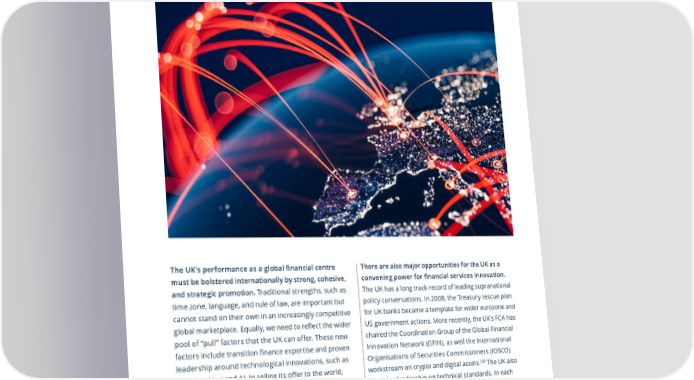 Vision for Economic Growth — a roadmap to prosperity 39 5. Pursue world-class promotion and interconnectivity Impact by 2030 Financial and professional services accelerate growth and prosperity across the UK. This comes through increased FDI into FPS, which flows into other sectors. It also derives from increased FPS exports and leadership in setting robust and pragmatic international standards around new technologies and sustainable finance. Overseas firms increasingly see the UK as a focus for investment, and a springboard for providing services globally. Context The UK’s FPS sector is recognised as a global leader 113 Its were managed on behalf of overseas clients. powering growth of the global economy. In 2022, it insurance market is also one of the top in the world, and the largest in Europe, helping businesses to manage attracted a combined value of £2bn in FPS foreign direct 114 The London Market is highly risk and associated costs. investment (FPS FDI) projects, whereby 昀椀rms in other export-oriented, with 68% of its business coming from countries make investments into the UK, either through 115 companies outside the UK and Ireland in 2020. setting up a new entity or expanding the operations here (see Figure 14). In 2022, this FDI created nearly UK services exports were the second highest in the 15,000 jobs. Over half of the jobs created in 2021 were 112116 There is also enormous opportunity outside London.world in 2022. to grow services to new markets through heightened The UK is also a top destination for international promotional activities. Moreover, trade 昀氀ows are not investors, including pension and sovereign wealth static. In 2021 for instance, the US represented 34.1% funds. Investors seek to invest in the UK as part of a 117 This represented an increase of the UK’s FS exports. 118 According to UNCTAD data, from 30.2% in 2019. diversi昀椀ed portfolio and also bene昀椀t from the UK’s asset UK net FS exports have held constant since 2008, management expertise, which can help them to channel The UK’s performance as a global 昀椀nancial centre their assets globally. Consequently, of the £11.6tn while the US, Singapore and Hong Kong have all There are also major opportunities for the UK as a 119 must be bolstered internationally by strong, cohesive, assets under management in the UK in 2021, 46% increased signi昀椀cantly. convening power for 昀椀nancial services innovation. and strategic promotion. Traditional strengths, such as The UK has a long track record of leading supranational time zone, language, and rule of law, are important but policy conversations. In 2008, the Treasury rescue plan Figure 14: UK FPS FDI in recent years cannot stand on their own in an increasingly competitive for UK banks became a template for wider eurozone and £ Million global marketplace. Equally, we need to re昀氀ect the wider 2,071 US government actions. More recently, the UK’s FCA has pool of “pull” factors that the UK can o昀昀er. These new chaired the Coordination Group of the Global Financial factors include transition 昀椀nance expertise and proven Innovation Network (GFIN), as well the International leadership around technological innovations, such as 869 Organisations of Securities Commissioners (IOSCO) 120 The UK also 1,339 open banking and AI. In selling its o昀昀er to the world, workstream on crypto and digital assets. provides leadership on technical standards. In each 1,234 UK FPS will need to show how it serves its clients in case, UK leadership draws on its existing strengths as 428 solving global challenges from the net zero transition 399 an international 昀椀nancial centre. to tech transformation, and how it can support 昀椀rms to 670 昀氀ourish and grow. Bringing together the full coalition of The following two big moves are catalysts to ensure 2981,202 UK players, with a strong vision and narrative, would 911835 powerfully increase the UK’s impact. that the UK’s FPS promotion is most impactful and 372 that it continues to be innovative in its approaches to embedding market access. 2019202020212022 Financial servicesProfessional services Source: fDi Markets data as published by the City of London Corporation (2023): https://www.theglobalcity.uk/resources/foreign-direct-investment.